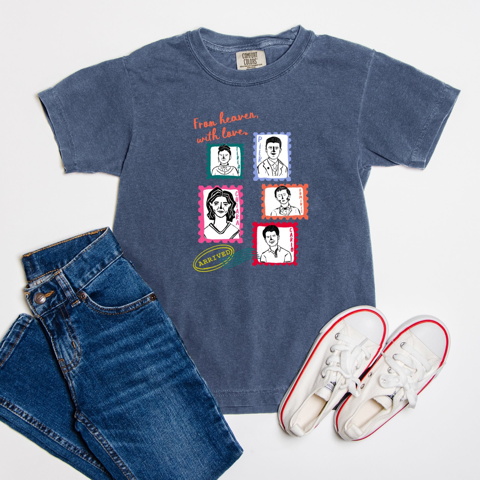 Like letters from home, this tee reminds us of our friends at home in Heaven. Saints Chiara, Terese, Dominic, Carlo and Pier pray for us!
