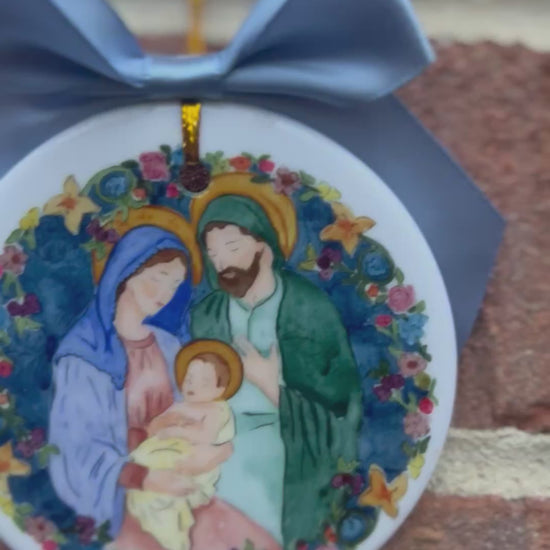 My story: I love to adorn our cribs with little crib ornaments. This year I was in search of a Holy Family one and when I couldn’t find the right one, I made it myself. This is hand painted art printed on a ceramic medallion hung with a blue stain bow. They are approx. 3”.