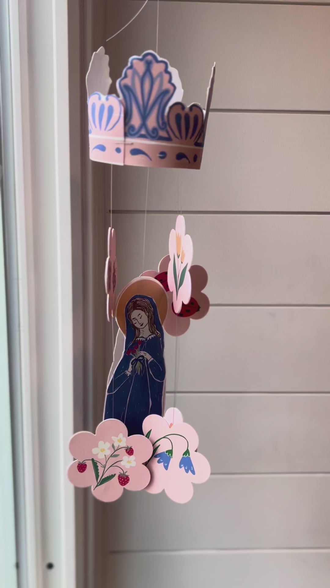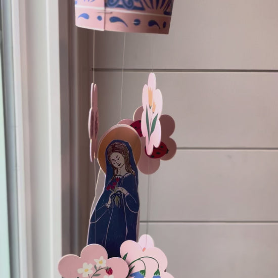 This printable becomes a 3D mobile to hang in your home during the month of May, or all year round. It hangs in our girls bedroom and they love watching Mary gently twirl at bedtime.